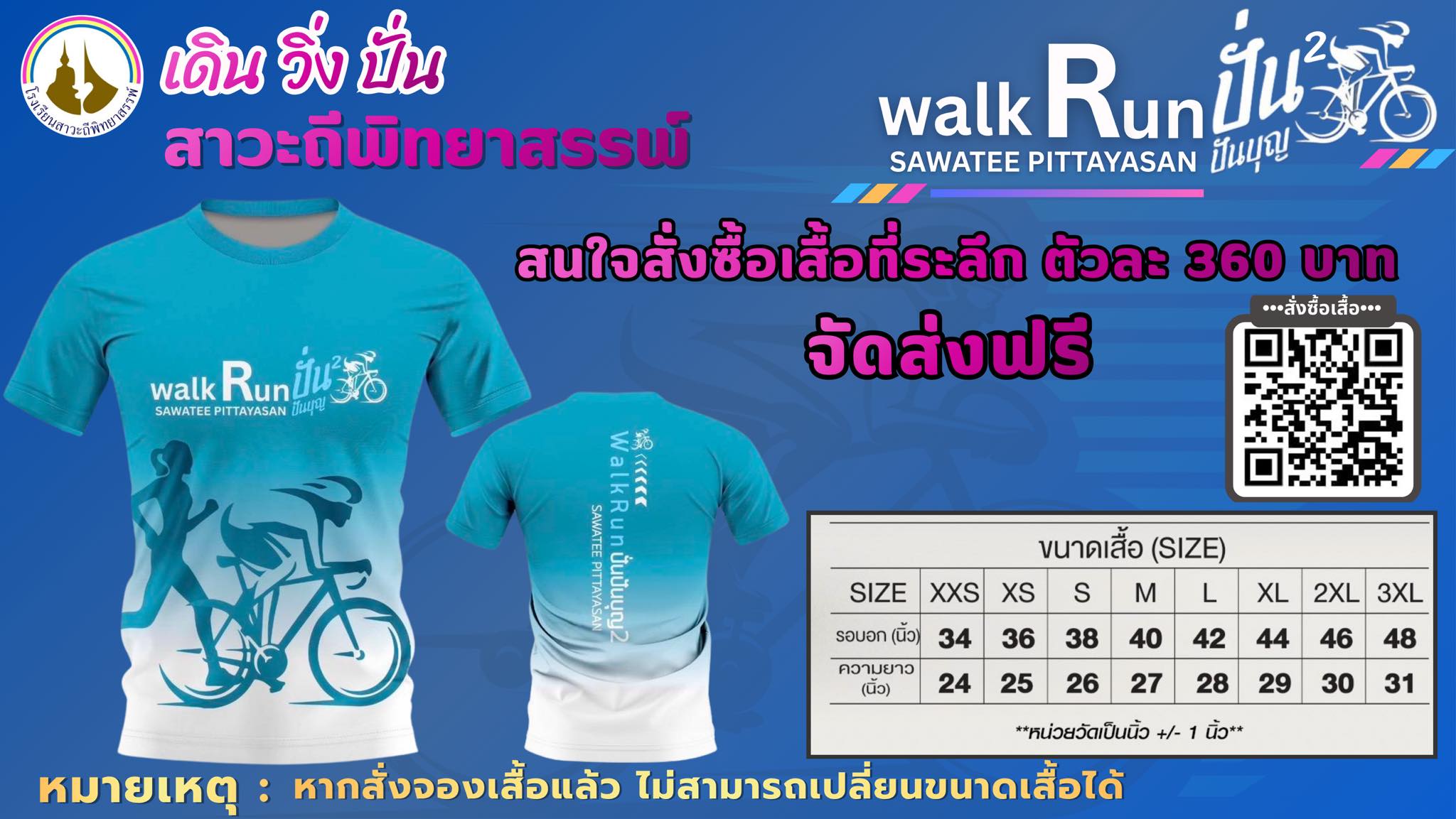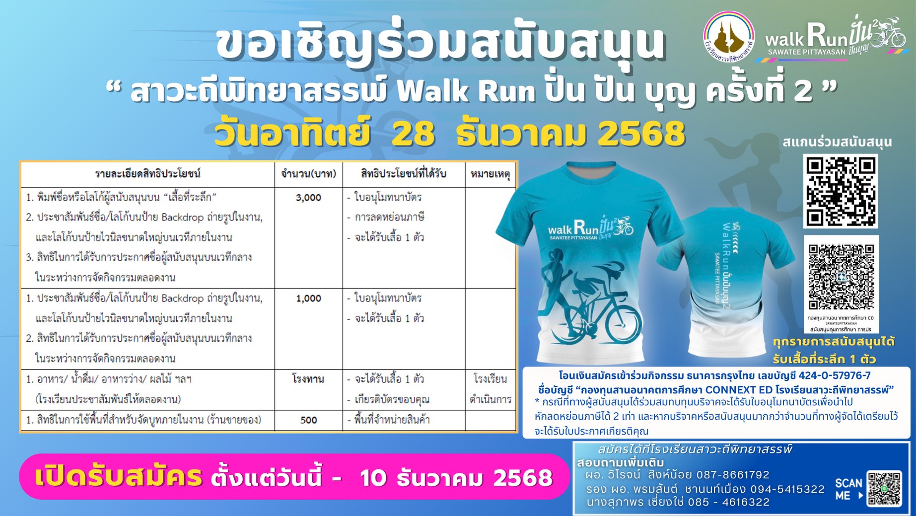 กำหนดการงาน Walk Run ปั่น ปัน บุญ ครั้งที่ 2 ณ โรงเรียนสาวะถีพิทยาสรรพ์ ในวันอาทิตย์ที่ 28 ธันวาคม 2568 เดิน 5 Km ในวันอา วิ่ง mini marathon 10 km ?‍♂️ ปั่น Charity Bike Rides 50 km ค่าสมัคร 360 บาท ทุกรายการ สนใจสมัคร ? : https://forms.gle/ 24 พ.ย. 68