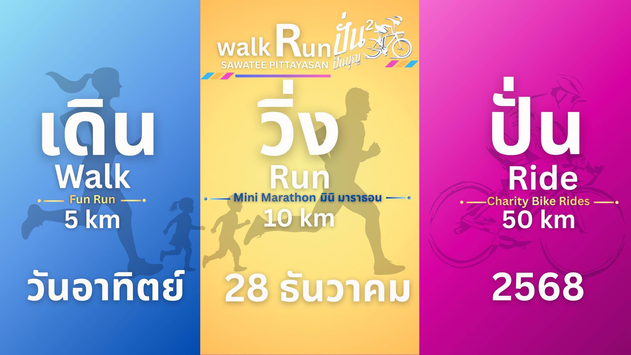 โรงเรียนสาวะถีพิทยาสรรพ์ ขอเชิญทุกท่าน มาร่วม เดิน วิ่ง ปั่น เพื่อการกุศล กับงาน Walk Run ปั่น ปัน บุญ ครั้งที่ 2 ณ โรงเรียนสาวะถีพิทยาสรรพ์ ในวันอาทิตย์ ที่ 28 ธันวาคม 2568 เดิน Fun Run 5 Km วิ่ง mini marathon 10 km Charity Bike Rides 50 km ค่าสมัคร 360 08 ธ.ค. 68