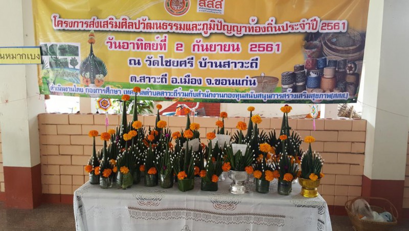 ครูและนักเรียนโรงเรียนสาวะถีพิทยาสรรพ์ เข้าร่วมโครงการส่งเสริมศิลปวัฒนธรรมและภูมิปัญญาท้องถิ่น ในวันที่ 2 กันยายน 2561 ณ วัดไชยศรี ต.สาวะถี อ.เมืองขอนแก่น จ.ขอนแก่น โดยมีวัตถุประสงค์เพื่อส่งเสริมศิลปวัฒนธรรมและภูมิปัญญาท้องถิ่นของตน |