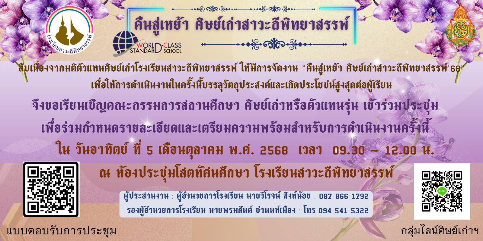 โรงเรียนสาวะถีพิทยาสรรพ์ ขอเรียนเชิญคณะกรรมการสถานศึกษา ศิษย์เก่าหรือตัวแทนรุ่น เข้าร่วมประชุม เพื่อปรึกษาหารือ “งานคืนสู่เหย้า ศิษย์เก่าสาวะถีพิทยาสรรพ์ 69“ ในวันที่ 5 ตุลาคม 2568 ณ ห้องประชุมโสตทัศนศึกษา คลิกลิงก์เพื่อเข้ากลุ่มศิษย์เก่า https://line.me