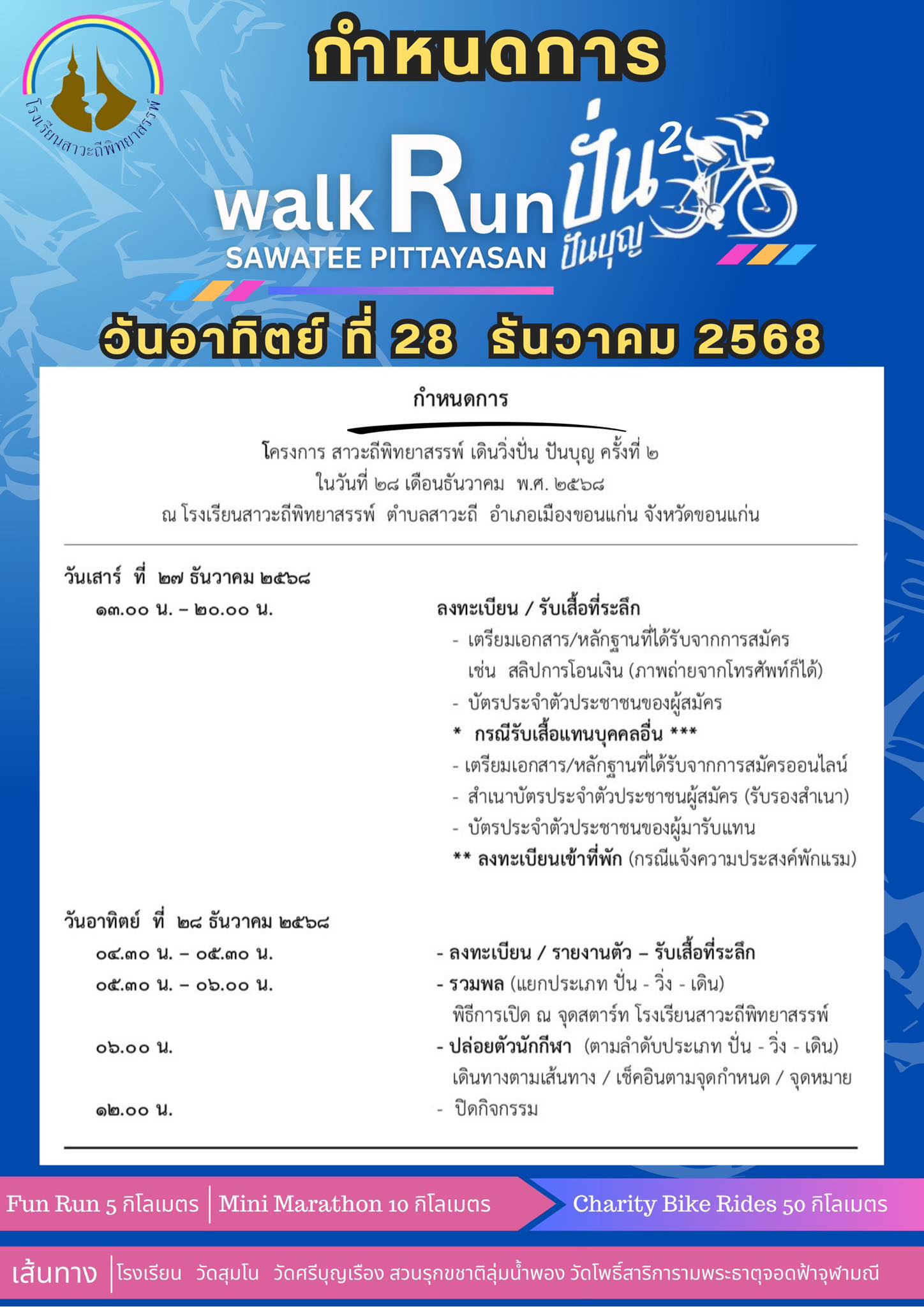 กำหนดการงาน Walk Run ปั่น ปัน บุญ ครั้งที่ 2 ณ โรงเรียนสาวะถีพิทยาสรรพ์ ในวันอาทิตย์ที่ 28 ธันวาคม 2568 เดิน 5 Km ในวันอา วิ่ง mini marathon 10 km ?♂️ ปั่น Charity Bike Rides 50 km ค่าสมัคร 360 บาท ทุกรายการ สนใจสมัคร ? : https://forms.gle/